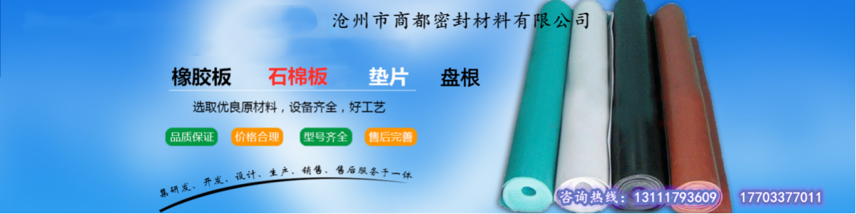 沧州商都密封材料有限公司13111793609 17703377011主要产品:石棉板,石棉橡胶板,工业橡胶板,普通橡胶板,鼓硫橡胶板,白橡胶板,红橡胶板,工业石棉板,石棉布等。公司位于河北河间市工业园区,该产品应用广泛,适用于电力、机械、石油、化工、冶金、造船、和交通运输等各个领域,产品规格齐全,质量稳定,销售于很多地方。我公司是一家经相关部门批准注册的企业。凭着良好的信用、服务与多家企业建立了长期的合作关系。而且,本公司以质量良好、产品可靠,信誉良好、用户至上的原则提供更加完善的服务,在市场经济中求发展,在业务开拓中求创新,以技术品质提升服务水准,开拓更加广阔的市场,竭诚为客户服务,欢迎新老用户和各界朋友光临指导!